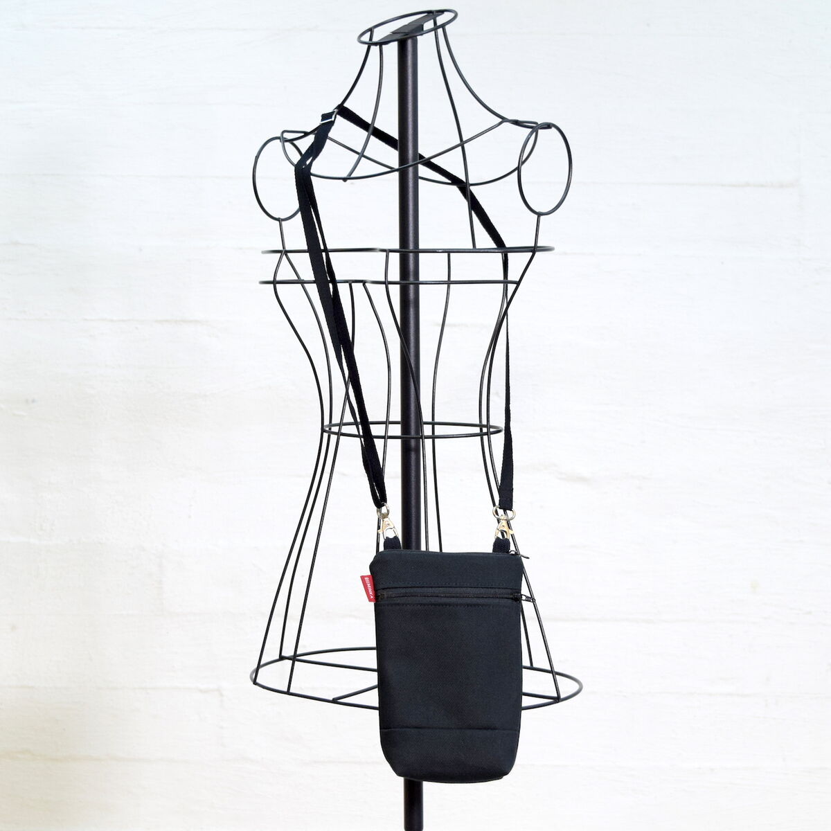 Kaksi vetoketjulla sulkeutuvaa lokeroa ja avainlenkki takana. Irrotettava ja säädettävä olkahihna.